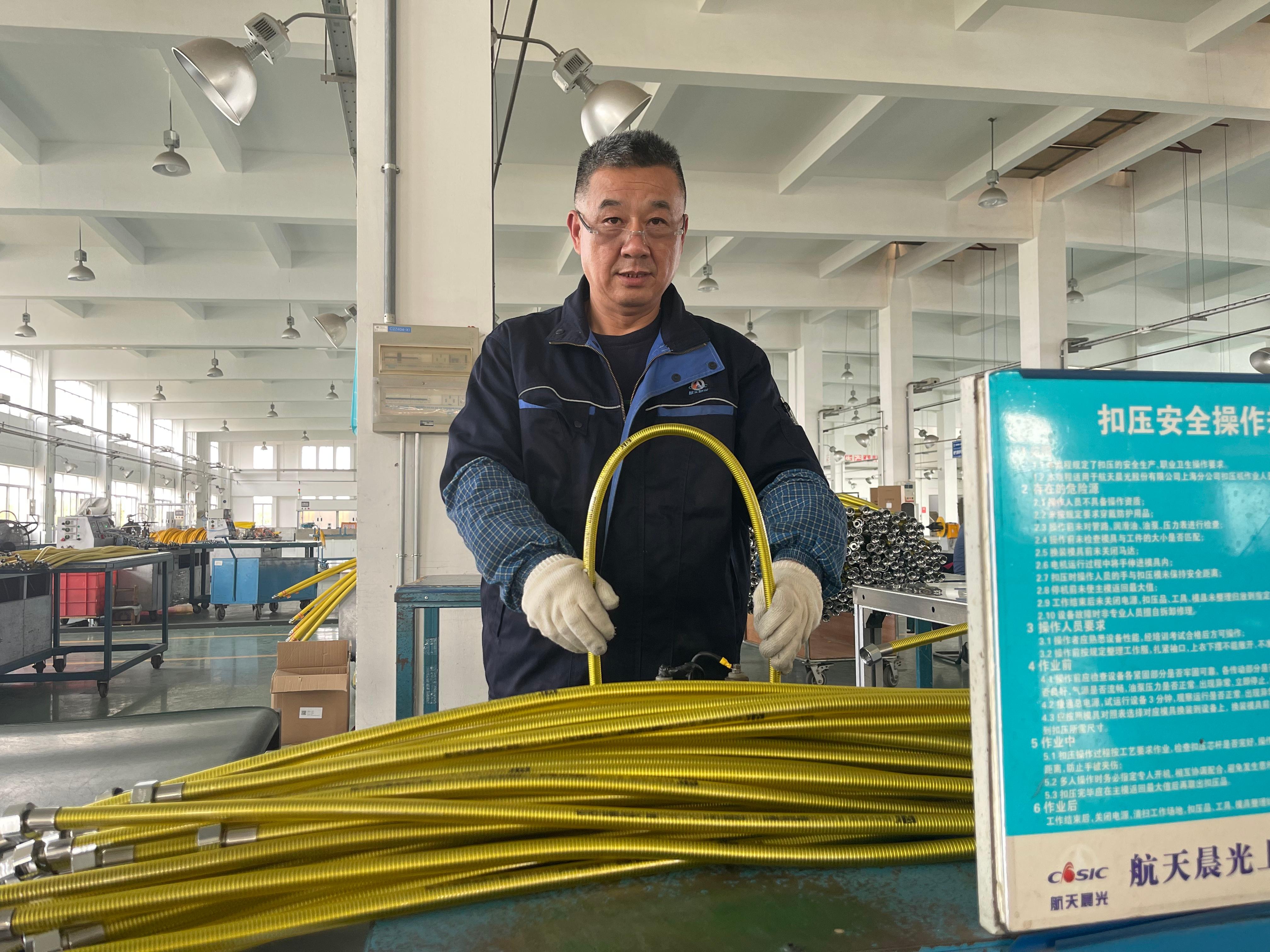 走進上海分公司的燃氣管工段,在一排排快速運轉(zhuǎn)的成型設(shè)備前,在鱗次櫛比的燃氣管包裝工序中,總是有一個始終忙碌而又堅定執(zhí)著的身影。那就是張衛(wèi)東,一位在生產(chǎn)一線默默耕耘了三十多年的老工匠。盡管歲月在他臉上刻下了深深的皺紋,雙手早已布滿了粗糙的老繭,但他的眼神中卻始終閃爍著對航天的熱愛、對晨光的深情。